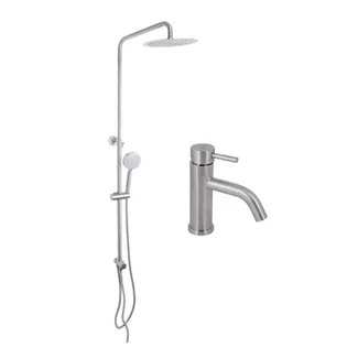 Функціональний комплект, що включає змішувач для раковини та універсальну душову стійку на два споживачі. Спільне використання забезпечує зручність та гармонійне оформлення ванної кімнати.